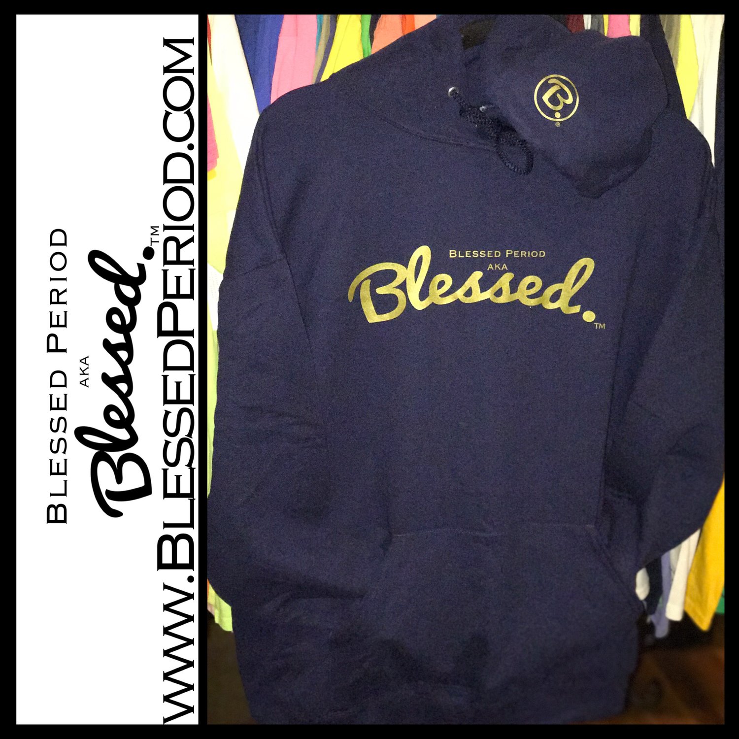 Deep Navy Blue + Metallic Gold Blessed Period aka “Blessed.” Logo Hoodie